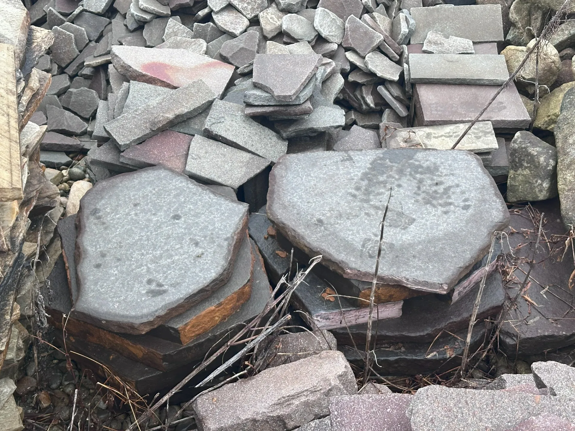 時には写真のような石の山の中からイメージに合う素材を探します。