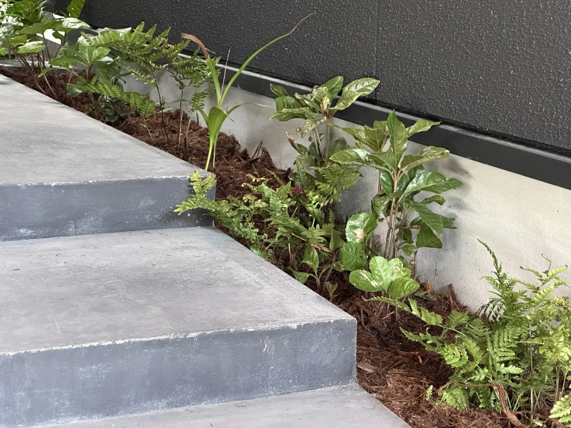 今回は滋賀県守山市にて、ブラックとグレーを基調としたスタイリッシュな住宅の玄関アプローチ植栽と門柱まわりの