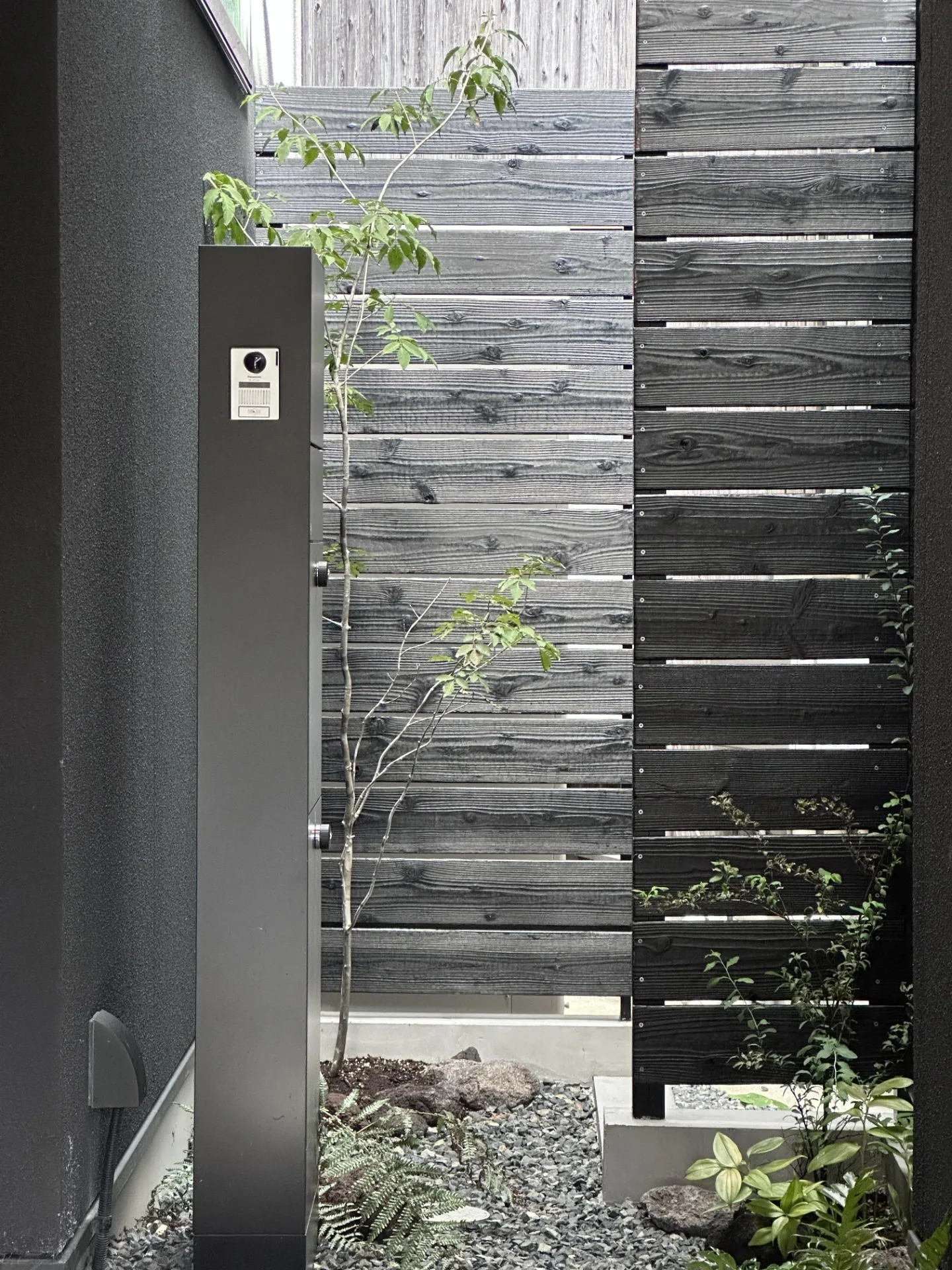【施工事例】ブラック×グレーの住宅に合わせた玄関アプローチ|植栽と門柱デザイン」|かっこいいモダン外構|近江八幡市|滋賀|外構|エクステリア|ガーデン|庭一設計企画|pino/niwaichi